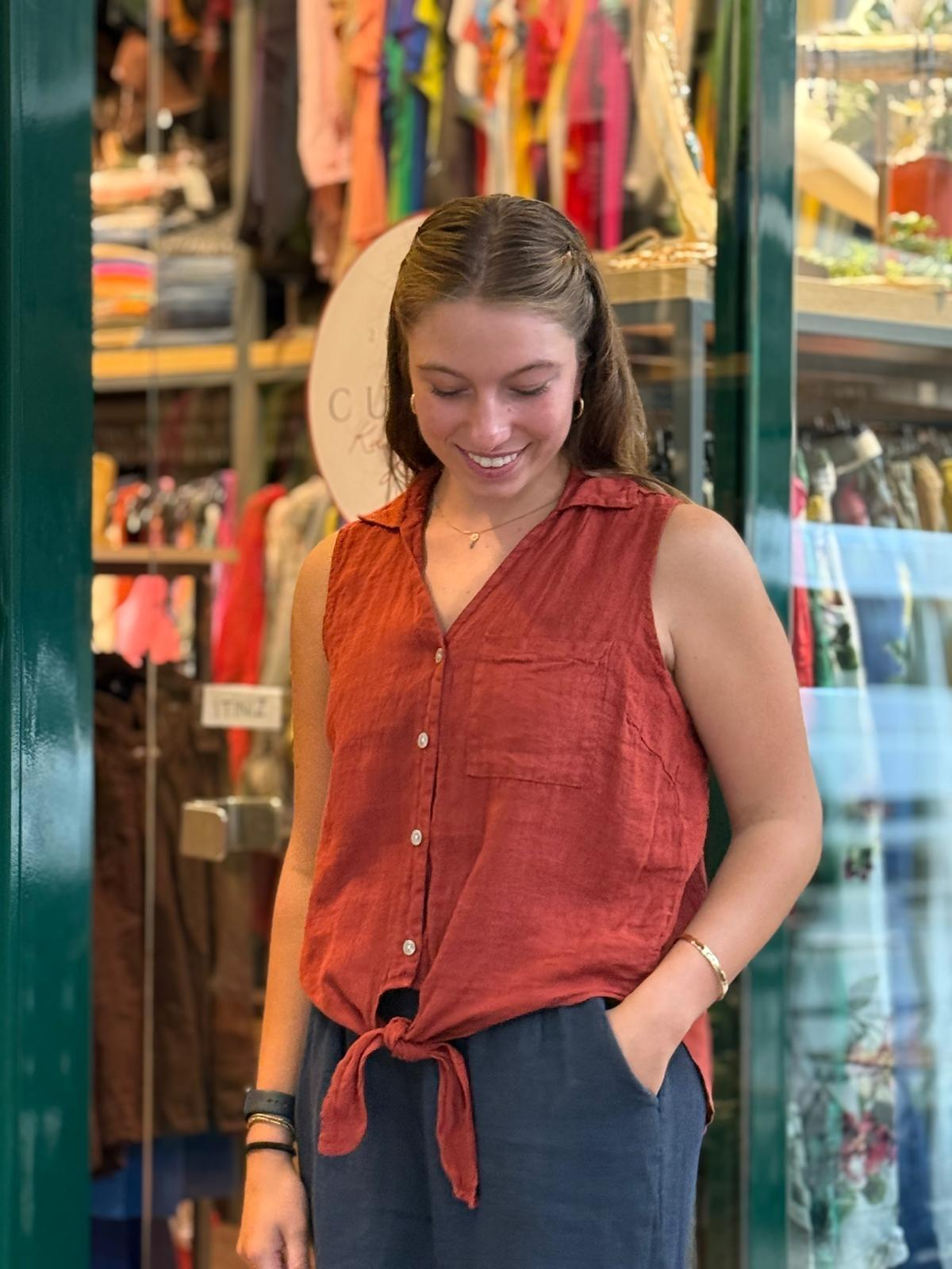 Bağlamalı Kolsuz İthal Keten Gömlek