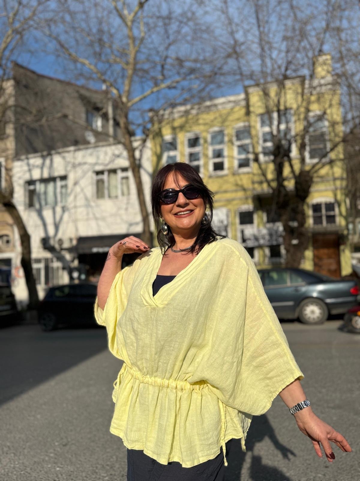 İthal Ham Keten V Yaka Yanı Bağcıklı Bluz