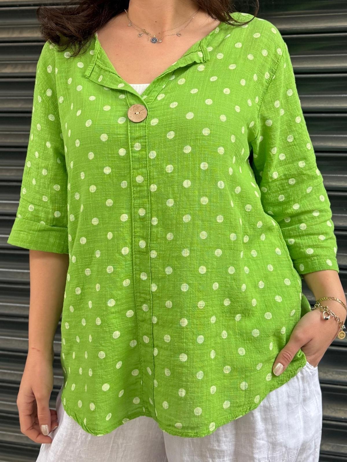İthal Puantiyeli Düğme Detaylı Keten Bluz