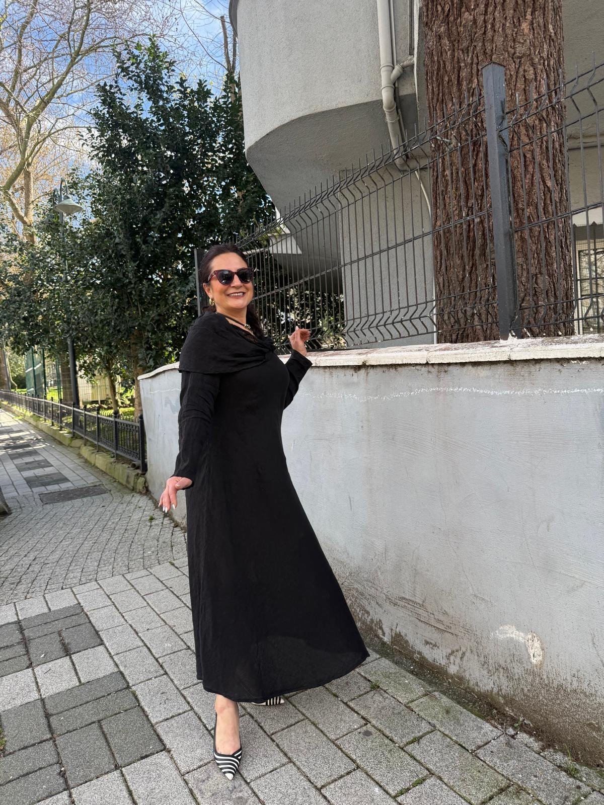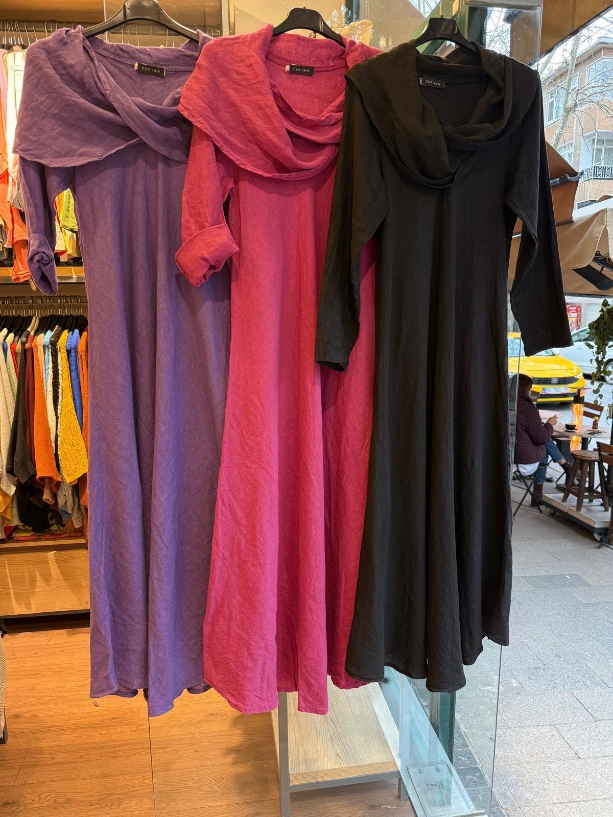 İthal Şal Yaka Keten Elbise