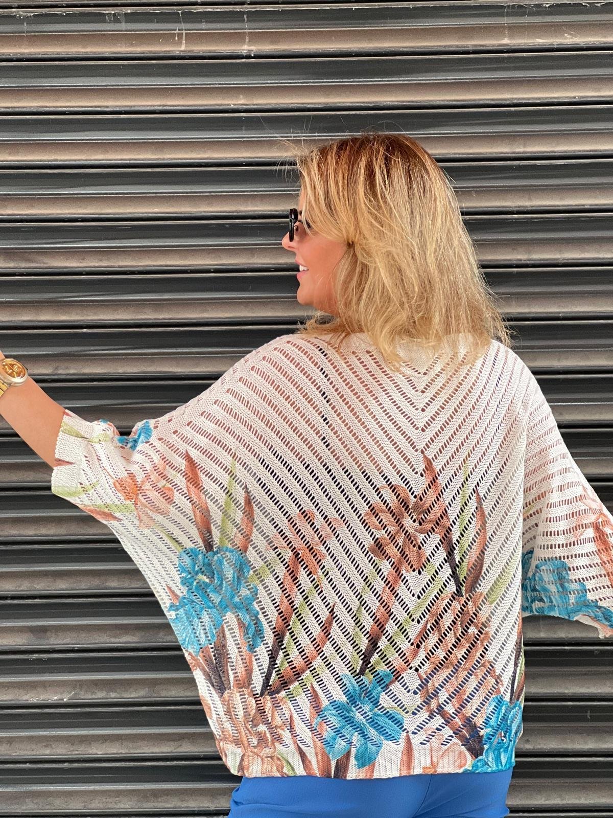 İthal V Yaka Ajurlu Turkuaz Çiçek Desenli Merserize