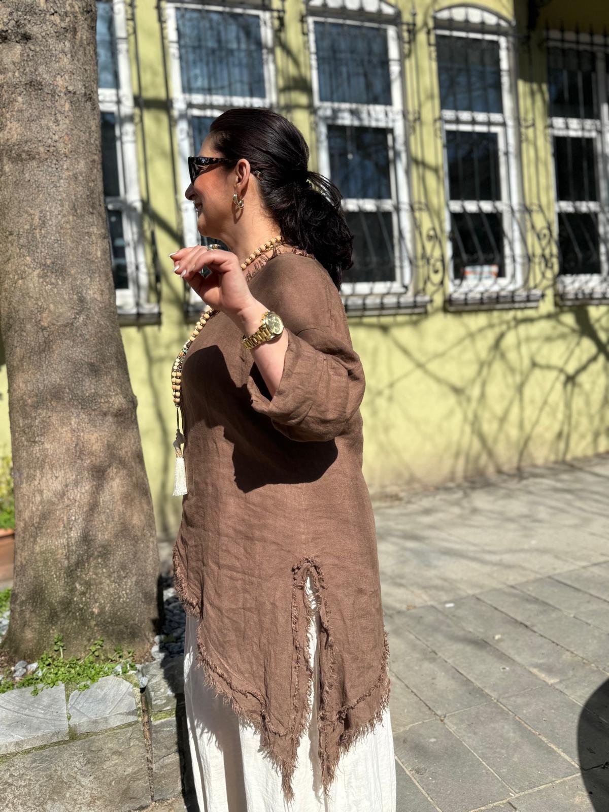 İthal V Yaka Asimetrik Keten Bluz