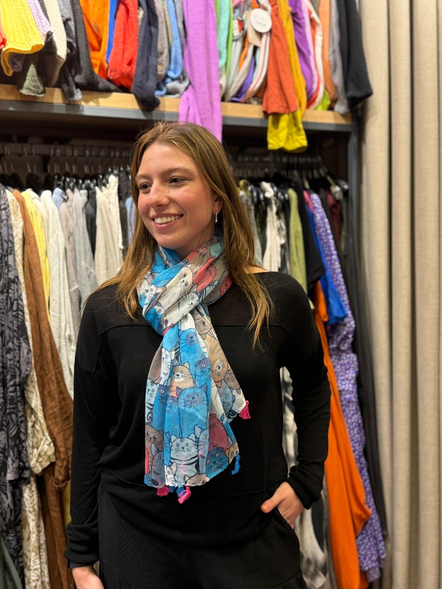 Kedi Desenli Pamuklu Dikdörtgen Şal